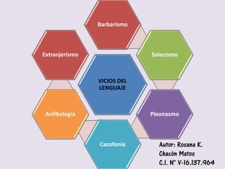 Este documento describe diferentes vicios del lenguaje como el barbarismo, el solecismo, el pleonasmo, la cacofonía, la anfibología y el extranjerismo. El barbarismo es el uso de palabras creadas siguiendo normas morfológicas y fonológicas que no pertenecen a nuestra lengua. La cacofonía es la repetición de sonidos idénticos. La anfibología es el ordenamiento inadecuado de las palabras de un texto dando un significado diferente. El extranjerismo es tomar un vocablo o frase de