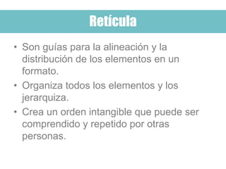 Las retículas son guías para la alineación y distribución de elementos en un documento que organizan y jerarquizan los contenidos. Se construyen definiendo los márgenes, columnas y espacios, y pueden ser de manuscrito, columnas o módulos. Las retículas módulos subdividen las columnas en celdas llamadas módulos para proyectos complejos.