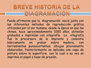 Este documento proporciona una breve historia de la diagramación desde sus orígenes en la imprenta china hasta su desarrollo en la era digital. Explica conceptos básicos como formatos, márgenes, caja de texto y columnas, e incluye consejos sobre el uso de tipografía, imágenes y espacios en blanco. También define varios formatos comerciales como boletines, brochures y páginas web.