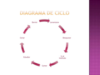 El documento presenta un diagrama circular que describe la rutina diaria típica de un estudiante de 4o de la Educación Secundaria Obligatoria. El diagrama muestra las actividades diarias como dormir, levantarse, comer, desayunar, ir al instituto, estudiar, comer, hacer ejercicio y asistir a clases de diferentes asignaturas. También presenta grupos de alimentos divididos en categorías como proteínas, lácteos, frutas y verduras, y carbohidratos.
