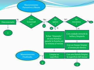 Este documento presenta procedimientos de mantenimiento preventivo para varios dispositivos de oficina como monitores, mouse, teclados, impresoras e impresoras de aguja. Para cada dispositivo, el documento describe si está conectado o no, y los pasos a seguir que incluyen desconectarlo, limpiar su interior y exterior con aire comprimido, franelas o hisopos, y volver a armarlo. El objetivo general es limpiar a fondo cada dispositivo para mantenerlo en buen estado.