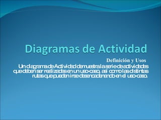 Un diagrama de actividad muestra las actividades que ocurren en un caso de uso y las posibles rutas que pueden seguirse, y se usa junto con diagramas de casos de uso para ayudar a comprender cómo se usa el sistema y cómo reacciona a eventos. Se compone de un círculo de inicio, óvalos para actividades y líneas con flechas para transiciones entre actividades.