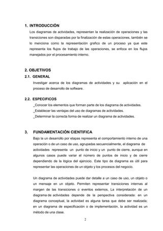 Este documento describe los diagramas de actividades, incluyendo sus elementos, propósito, ventajas y desventajas. Explica que los diagramas de actividades representan el flujo de tareas y operaciones de un proceso, con nodos para el inicio, acciones, decisiones y final. Proporciona un ejemplo de diagrama de actividades para un sistema de software con múltiples caminos dependiendo de la entrada del usuario.