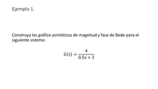 El documento presenta 5 ejemplos de construcción de diagramas de Bode para diferentes sistemas. En cada ejemplo se calculan los factores de cada término, se identifican las frecuencias de corte y las pendientes, y se grafican los diagramas asintóticos de magnitud y fase.