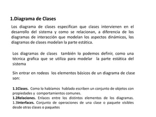 Este documento describe los elementos básicos de un diagrama de clases, incluyendo clases, relaciones, interfaces y visibilidad. Explica que las clases representan conjuntos de objetos con propiedades y comportamientos comunes, y que las relaciones muestran las conexiones entre clases. También cubre los tipos de relaciones como asociaciones, generalizaciones y dependencias, así como conceptos como multiplicidad y responsabilidades. Por último, proporciona ejemplos de diagramas de clases para una universidad, una tienda y una biblioteca.