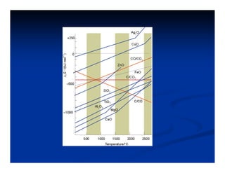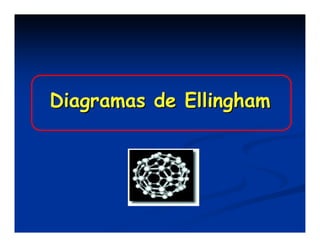 El documento describe los diagramas de Ellingham, que muestran la relación entre la variación de la energía libre estándar (ΔG°) de reacciones de oxidación y la temperatura. Ellingham observó que estas relaciones se aproximaban a rectas en rangos de temperatura donde no ocurrían cambios de fase. Los diagramas permiten predecir la estabilidad termodinámica relativa de óxidos a diferentes temperaturas.