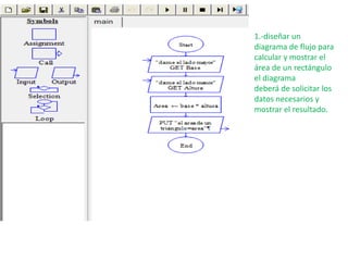 El documento presenta 6 problemas que involucran el diseño de diagramas de flujo para calcular áreas de rectángulos, promedios y calificaciones de estudiantes, comparar precios de pizzas, y calcular la suma de números usando ciclos. Se pide diseñar diagramas de flujo para cada problema que soliciten los datos necesarios, realicen los cálculos correspondientes, y muestren los resultados.