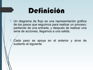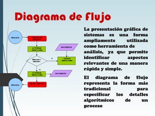 El documento describe los diagramas de flujo, incluyendo sus definiciones, símbolos, metodología y reglas. Los diagramas de flujo representan los pasos de un proceso gráficamente, usando símbolos como círculos, cuadrados y flechas para mostrar las entradas, salidas, decisiones y flujo del proceso. Permiten analizar y especificar procesos de manera visual y sencilla.