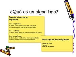 Un algoritmo es un conjunto ordenado y finito de instrucciones que conducen a la solución de un problema. Los algoritmos deben ser precisos, finitos y definidos. Se componen de entrada de datos, procesos y salida de resultados. Pueden representarse mediante diagramas de flujo o texto. Los diagramas de flujo utilizan símbolos para mostrar los procesos y su organización para llegar a la solución de un problema.