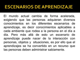 El documento describe cómo el mundo actual requiere aprendizaje continuo debido a los rápidos cambios. Señala que el aprendizaje ocurre en diversos escenarios como el personal, social, familiar y laboral. También explica que el aprendizaje autónomo es una forma de mantenerse actualizado a bajo costo mediante el compromiso, la disciplina y la voluntad para dominar nuevas tecnologías de manera eficiente. Además, resalta que el e-learning es una herramienta útil para el aprendizaje que permite adquirir