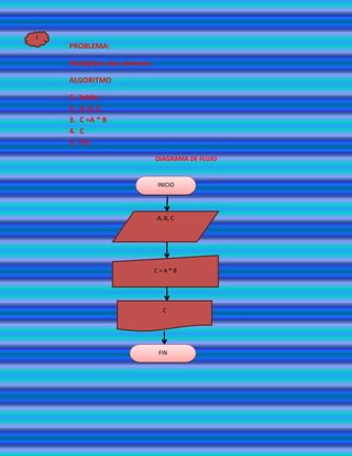 Los documentos presentan algoritmos y diagramas de flujo para resolver diversos problemas matemáticos, como hacer un café, multiplicar números, sacar edades, promedios, áreas de figuras geométricas, ecuaciones y más. Cada uno sigue los pasos de inicio, proceso y fin para explicar de manera secuencial la solución al problema planteado.