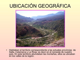 Los diaguitas habitaban el noroeste de la Argentina, en las provincias de Salta, Catamarca y La Rioja. Vivían en aldeas organizadas gobernadas por dos caciques, uno para las tierras altas y otro para las bajas. Se dedicaban principalmente a la agricultura, cultivando maíz, zapallo y otras verduras en terrazas regadas artificialmente. Construyeron fuertes llamados pucará para protegerse y hablaban el idioma kakán.