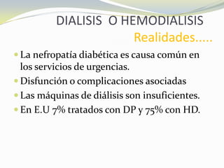Este documento resume los resultados de varios estudios que comparan la hemodiálisis y la diálisis peritoneal. Indica que no hay diferencias claras en la supervivencia entre los dos métodos, y que los factores de riesgo del paciente como la edad, enfermedades como la diabetes, y la función renal residual son más importantes. También discute las ventajas y desventajas de cada método y los tipos de pacientes que se beneficiarían más de cada uno. Concluye que no hay un método claramente superior y que depende de las características