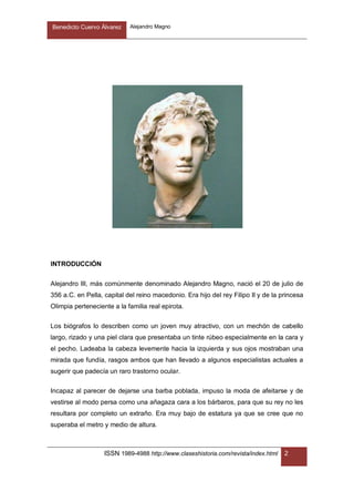 El documento proporciona información biográfica sobre Alejandro Magno, incluyendo detalles sobre su nacimiento, educación bajo Aristóteles, y sus campañas militares para someter Grecia y luego conquistar el Imperio persa, llegando hasta la India. En menos de 13 años, Alejandro logró crear un vasto imperio que se extendía desde Europa hasta el noroeste de la India.
