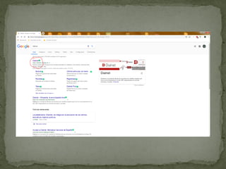 El documento proporciona instrucciones sobre cómo usar la base de datos Dialnet para encontrar artículos sobre el uso de la fisioterapia en el tratamiento y prevención de la artritis y la artrosis. Explica cómo buscar en Dialnet, seleccionar documentos relevantes, acceder a textos completos cuando están disponibles directamente o a través de enlaces externos como REBIUN y Science Direct.