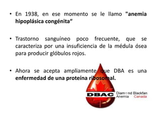 La anemia de Diamond Blackfan es un trastorno sanguíneo poco frecuente que se caracteriza por una insuficiencia de la médula ósea para producir glóbulos rojos. Se diagnostica principalmente en niños menores de un año y causa anemia, reticlocitopenia y una médula ósea con escasez de precursores de células rojas. El tratamiento incluye corticoesteroides, transfusiones sanguíneas y en algunos casos trasplante de médula ósea.