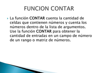 La función CONTAR cuenta el número de celdas que contienen números dentro de un rango o matriz especificados. La función AREAS devuelve el número de áreas (rangos de celdas adyacentes o celdas individuales) dentro de una referencia dada. La función BUSCAR busca un valor en un primer rango y devuelve un valor correspondiente de la misma posición en un segundo rango.