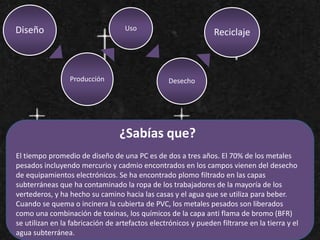 El documento describe las diferentes etapas del ciclo de vida de una computadora, incluyendo el diseño, producción, uso, desecho y reciclaje. También explica los problemas ambientales y de contaminación que pueden surgir debido a los desechos electrónicos, como la liberación de metales pesados y toxinas. Además, ofrece recomendaciones sobre cómo prevenir la contaminación y el deterioro ambiental relacionados con los equipos electrónicos.