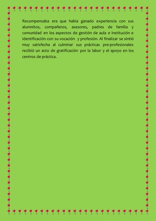 Paulina estaba cursando su décimo semestre de la carrera de Educación Inicial y realizando sus prácticas pre-profesionales. Durante sus prácticas en la I.E. Edwuard Kennedy, Paulina desarrolló diferentes actividades y estrategias para mantener a los niños entretenidos y ayudarlos a aprender de manera más fácil. A pesar de no recibir un pago por sus prácticas, Paulina se sintió feliz de ver el progreso de los niños y ganó valiosa experiencia que la ayudará