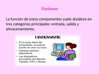 El documento describe los principales componentes de hardware y software de una computadora. En cuanto al hardware, menciona los elementos internos como la tarjeta madre, procesador, memoria RAM y ROM, tarjeta de video y fuente de poder. Explica que el software son las instrucciones que manipulan datos e incluyen programas de aplicación, programación y sistemas.