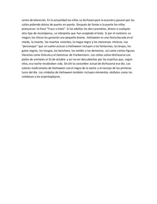 Halloween se originó como una fiesta celta hace más de 2,500 años para marcar el final del verano y el comienzo del invierno. Los celtas creían que en la noche del 31 de octubre, los espíritus podían apoderarse de los vivos a menos que se les ofrecieran ofrendas. La Iglesia Católica luego convirtió la festividad en el Día de Todos los Santos y su víspera, All Hallows' Eve, dio origen al nombre "Halloween". La tradición se exportó a Estados Unidos en el siglo