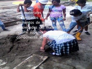 Este documento describe diferentes tipos de materiales compuestos utilizados en la construcción. Explica que los materiales compuestos están formados por dos o más elementos cuya propiedad combinada es superior a la de los componentes individuales. Luego clasifica los materiales compuestos en tres categorías principales - de matriz polimérica, de matriz metálica y de matriz cerámica - y proporciona ejemplos de cada uno. Finalmente, describe brevemente varios materiales cerámicos comunes como el mortero, hormigón, piedra artificial y fibrocemento.