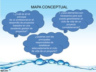 Este documento discute la gerencia de proyectos de tecnología educativa. Explica que el rol principal de un profesional en el desarrollo de proyectos es organizar y administrar los recursos teniendo en cuenta el alcance y el tiempo. Señala que los principales responsables de establecer adecuadamente el ciclo de vida de un proyecto son los que planifican, hacen, revisan y actúan. Finalmente, destaca que para garantizar un ciclo de vida completo de un proyecto se debe revisar las estrategias de gestión
