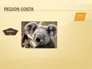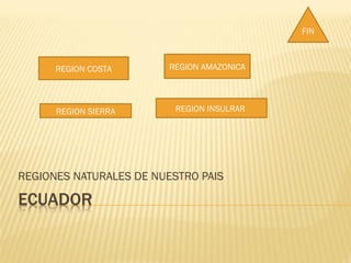 El documento divide el país en cuatro regiones naturales: la región costa, la región insular, la región sierra y la región amazónica.