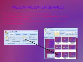 Este documento proporciona instrucciones sobre cómo crear y modificar presentaciones en PowerPoint. Explica cómo crear una presentación en blanco o con plantilla, guardar una presentación en diferentes formatos como presentación o página web, abrir presentaciones existentes, y utilizar las diferentes vistas como normal, clasificador de diapositivas y presentación. También cubre cómo insertar, copiar, eliminar y modificar diapositivas y objetos, incluido el uso de reglas, cuadrículas y guías.