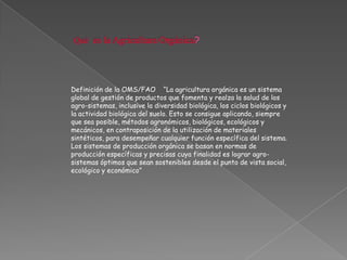 La agricultura orgánica es un sistema de gestión global que promueve la salud de los agroecosistemas mediante métodos agronómicos, biológicos y ecológicos en lugar de insumos sintéticos. Está basada en normas específicas que buscan lograr sistemas agrícolas sostenibles desde lo social, ecológico y económico. La agricultura convencional se basa en monocultivos, fertilizantes sintéticos y plaguicidas, mientras que la orgánica promueve la