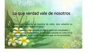 El documento argumenta que el estudio es el mejor camino para lograr el éxito y alcanzar las metas, pero que la verdadera felicidad consiste en creer en uno mismo y superar los obstáculos con una actitud positiva y emprendedora, no dejando que los sueños se frustren a pesar del esfuerzo y sufrimiento que conllevan.