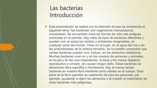 Las bacterias son organismos microscópicos unicelulares que se encuentran en todos los ambientes y juegan un papel importante en los ciclos naturales. Existen muchos tipos diferentes de bacterias que varían en forma, estructura y función. Algunas bacterias son benéficas, mientras que otras pueden causar enfermedades. Los antibióticos se usan para tratar infecciones bacterianas, pero es importante su uso responsable para prevenir la resistencia a los antibióticos.