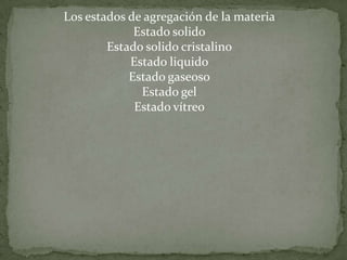 El documento presenta información sobre los diferentes estados de agregación de la materia (sólido, líquido y gaseoso), sus propiedades características, y conceptos relacionados como mezclas homogéneas y heterogéneas. También describe las teorías atómicas de Dalton y Planck, y conceptos clave de la tabla periódica como las propiedades periódicas, estructura electrónica, potencial de ionización y electronegatividad.