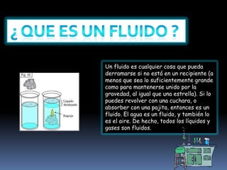 Un fluido es cualquier sustancia que puede fluir y cambiar de forma para adaptarse al recipiente que lo contiene, como los líquidos y gases. Los fluidos se caracterizan por poder cambiar continuamente la posición relativa de sus moléculas y ser compresibles. Se clasifican en newtonianos, cuya viscosidad es constante, y no newtonianos, cuya viscosidad varía. Algunas propiedades primarias de los fluidos son la presión, densidad y temperatura.