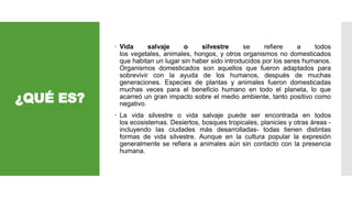 Este documento describe la vida silvestre y las principales causas de extinción de especies como la sobreexplotación y la destrucción de hábitats. Explica que la vida silvestre incluye plantas, animales y otros organismos no domesticados que habitan un lugar de forma natural. También menciona algunos animales en peligro de extinción y formas de evitar que las especies desaparezcan como proteger sus hábitats y combatir la caza ilegal.