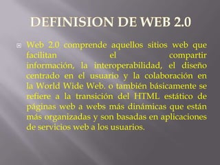 La Web 2.0 permite compartir información e interactuar de forma colaborativa en la web. Facilita el aprendizaje mediante la socialización del conocimiento. Se mencionan varias herramientas de la Web 2.0 como Google Sites, AbiWord y Evernote que permiten crear sitios web, procesar textos y almacenar notas multimedia respectivamente.