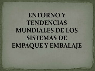 El documento describe las tendencias globales en los sistemas de empaque y embalaje y cómo están afectando a los consumidores. Las influencias económicas, demográficas y sociales como el crecimiento económico, los cambios demográficos y los estilos de vida están llevando a un mayor consumo y uso de empaques más pequeños. Esto, junto con las actitudes cambiantes de los consumidores y los sistemas de recolección de desechos, están impulsando a los fabricantes a adaptarse a los nuevos requisitos.