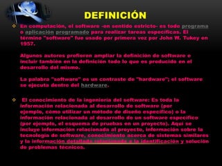El documento define y clasifica diferentes tipos de software, incluyendo software de sistema, software de programación y software de aplicación. El software de sistema incluye sistemas operativos, controladores, herramientas de diagnóstico y más. El software de programación incluye editores de texto, compiladores, intérpretes, enlazadores y depuradores. El software de aplicación permite a los usuarios realizar tareas específicas en diferentes campos. El documento también distingue entre software libre y privativo.