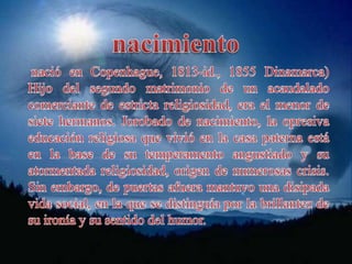 Soren Kierkegaard fue un filósofo danés nacido en 1813 que es considerado el padre del existencialismo. Algunas de sus ideas más importantes fueron la subjetividad y el salto de fe. Escribió numerosas obras criticando el racionalismo hegeliano y enfatizando la importancia de la experiencia individual. También criticó la politización e institucionalización de la iglesia en Dinamarca, argumentando que esto iba en contra de la doctrina cristiana de enfocarse en la relación individual con Dios.