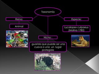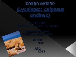 El documento describe la taxonomía, características, ecología y estado de conservación del zorro andino (Lycalopex culpaeus). Mide aproximadamente 70 cm de longitud y habita en la Cordillera de los Andes y Tierra del Fuego. Es una especie problemática debido a su acción predadora sobre el ganado, aunque según la UICN su estado de conservación es de preocupación menor.