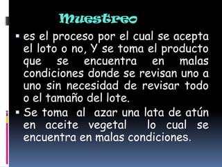 El resumen describe los pasos del proceso de inspección de productos, incluyendo la inspección visual de productos individuales para detectar daños, la inspección muestral que revisa una pequeña porción del lote para determinar su aceptación, y la inspección del 100% de los productos. El documento concluye explicando que la inspección completa requiere tiempo y recursos para contar todos los productos y tomar una decisión final sobre su aceptación.