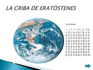 La criba de Eratóstenes es un algoritmo que permite hallar todos los números primos menores que un número dado creando una tabla de números entre 2 y N, tachando los múltiplos de los números declarados primos hasta que el cuadrado del mayor primo es mayor que N.