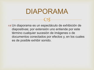 Un diaporama es una técnica audiovisual que consiste en proyectar de forma sincronizada imágenes diapositivas sobre una o más pantallas con una banda sonora. Originalmente se refería a la exhibición de diapositivas, pero ahora también incluye presentaciones digitales creadas con software como PowerPoint que contienen fotografías y pueden ser conferencias profesionales o espectáculos públicos. Algunos software de edición de imágenes también usan el término diaporama para referirse a mostrar una selección de imágenes en pantalla completa.