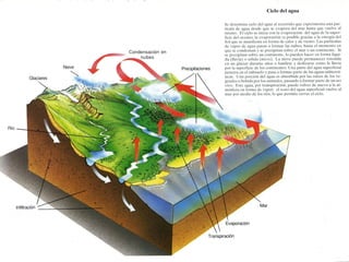 El documento discute la insostenibilidad del consumo actual de agua dulce y la explotación excesiva de las aguas subterráneas. Aunque el agua dulce se renueva a través de la lluvia a una tasa de 40,000 a 50,000 km3 por año, el consumo mundial se duplica cada 20 años y la extracción de aguas subterráneas es tan intensa que las reservas se agotan más rápido que la recarga por precipitaciones. Esto amenaza las reservas de agua dulce y la capacidad de