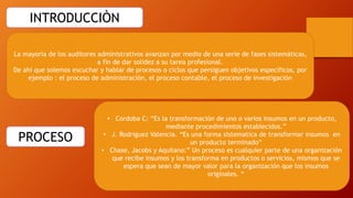 Este documento describe el proceso de auditoría administrativa y sus diferentes fases. Presenta los integrantes del equipo de auditoría y ofrece definiciones de proceso, auditoría administrativa y conocimiento científico. Explica las fases de identificación, planeación y desarrollo de la auditoría, incluyendo actividades como el estudio preliminar, diagnóstico, planeación y obtención de datos. El objetivo principal es allegarse de información relevante y confiable para realizar un análisis que conduzca a una evaluación fundamentada.