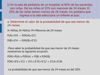 Este documento presenta 4 ejercicios de estadística y probabilidad. El primer ejercicio calcula la probabilidad de que un paciente pediátrico sea menor de 24 meses. El segundo representa las probabilidades de dos enfermedades usando un diagrama de Venn. El tercero calcula la probabilidad de averías en autobuses de diferentes líneas. El cuarto calcula la probabilidad de acertar el blanco al disparar dos tiradores.