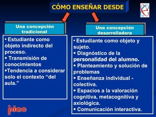 El documento presenta dos concepciones de la enseñanza y el aprendizaje: la tradicional y la desarrolladora. La concepción tradicional considera al estudiante como objeto y se centra en la transmisión de conocimientos, mientras que la concepción desarrolladora ve al estudiante como sujeto activo y promueve el diagnóstico de su personalidad, la solución de problemas, y la enseñanza individualizada y colectiva.