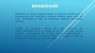 Brainshark es un software en línea que permite subir presentaciones de PowerPoint con audio, editarlas en línea, agregar contenido adjunto y compartirlas con otros de forma colaborativa e inmediata. Otras herramientas como Knovio y PowToon permiten crear presentaciones y videos animados sincronizando PowerPoint con video en línea de forma sencilla. Haiku Deck se enfoca en presentaciones minimalistas de una imagen con título y subtítulo para promover la brevedad.