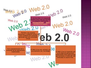 El documento define el término Web 2.0 como sitios web que facilitan el compartir información y la interacción entre usuarios a través de contenido generado por los usuarios. Explica que Web 2.0 no es una tecnología en sí, sino una actitud centrada en el usuario y la innovación a través de características distribuidas. También menciona que los proyectos deben evolucionar continuamente para adaptarse a los cambios constantes de Internet.