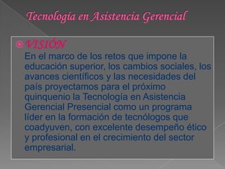 El documento presenta la visión, objetivos y perfiles del programa de Tecnología en Asistencia Gerencial Presencial. El programa busca formar tecnólogos integrales con conocimientos en administración, contabilidad, idiomas e informática para brindar asistencia gerencial en organizaciones y contribuir al desarrollo social y económico. Los egresados podrán desempeñarse como asistentes gerenciales en empresas públicas y privadas.